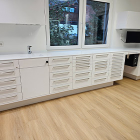 Perfekte Hygiene durch völlige Kunststoffummantelung, robust und säurebeständig. Die leicht laufenden Schubladen werden, soweit gewünscht, mit Einsätzen geliefert.
